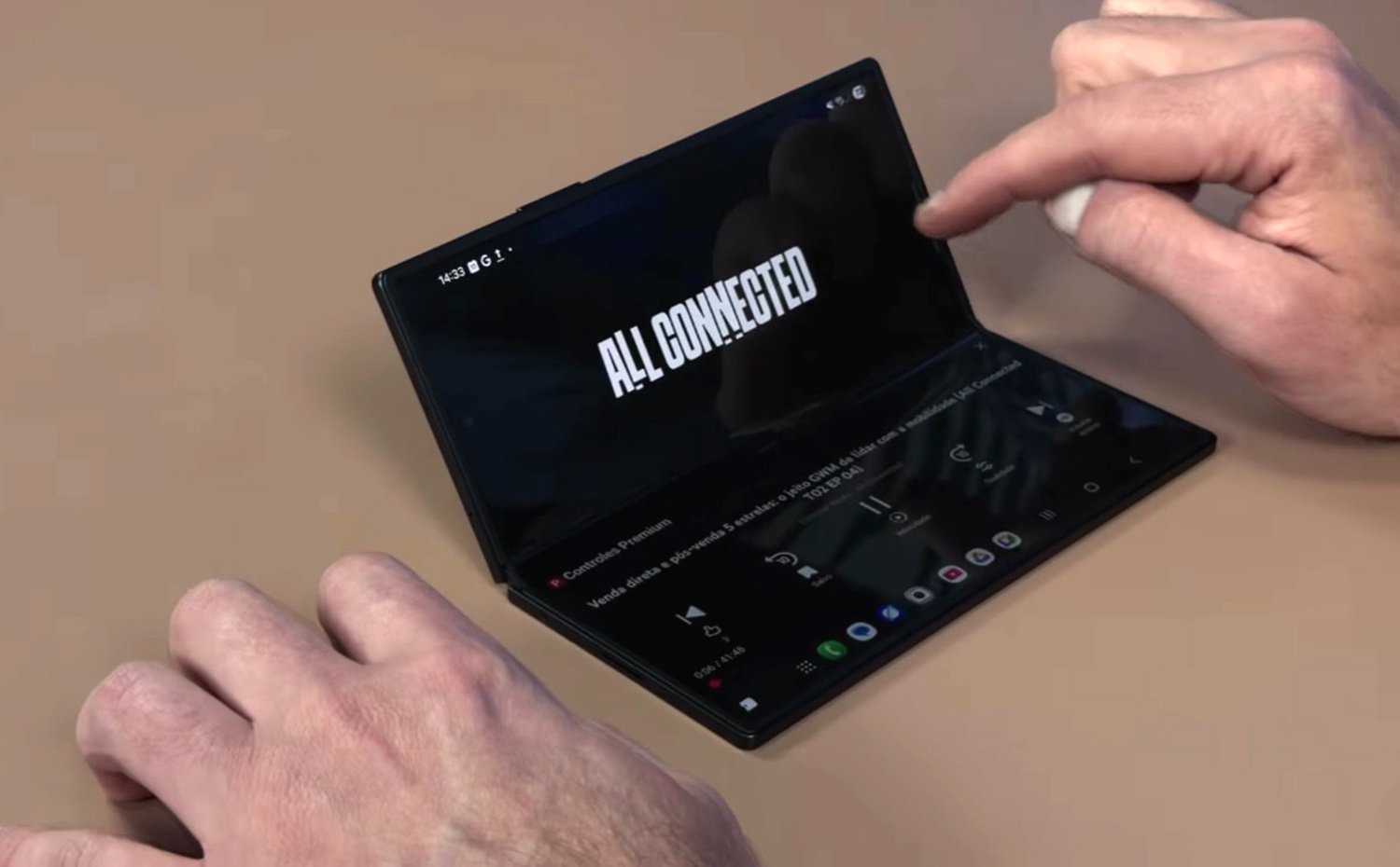 O modo Flex coloca o vídeo em cima e os controles embaixo quando o Fold está semiaberto. Parece bobo, mas muda muito quando você tá no avião, Uber ou sala de espera. E claro, ninguém merece segurar o celular por 40 minutos com o braço tremendo. O Fold faz isso pra você quando dobrado, uma estabilidade que resolve o seu problema.